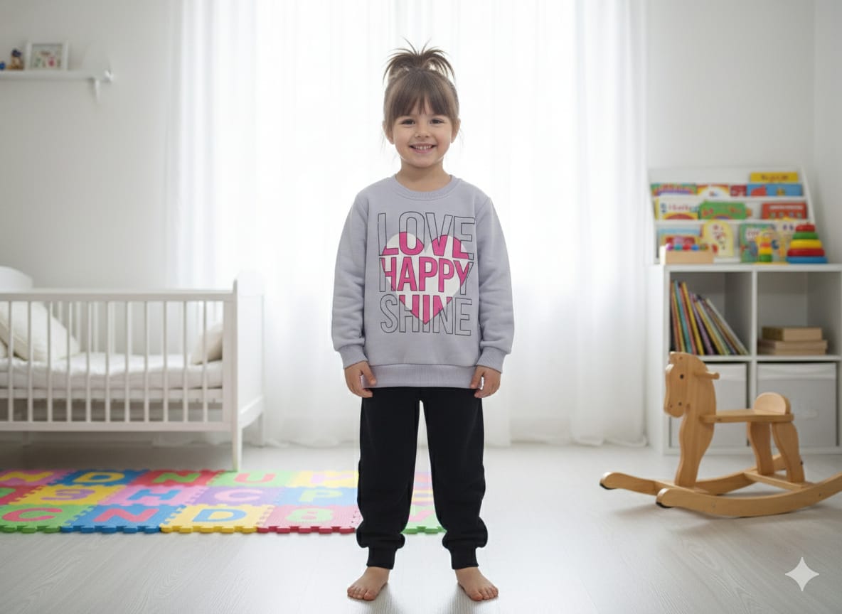 Sweatshirt: Modaya uygun ve nötr Açık Gri Melanj rengindedir. Ön yüzünde canlı pembe ve beyaz tonlarda büyük harflerle “LOVE”, “HAPPY” ve “SHINE” (Sevgi, Mutluluk, Işıltı) yazılı, göz alıcı bir baskı yer alır.