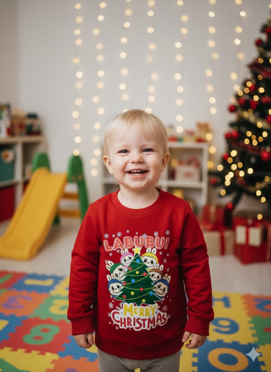 Bu neşeli ve capcanlı kırmızı sweatshirt ile minik Labubu hayranınızı yılbaşı ruhuna hazırlayın! Popüler Labubu ve arkadaşlarının sevimli figürleriyle süslenmiş bu özel tasarım kazak, yılbaşı ağacı ve “Merry Christmas” (Mutlu Noeller) yazısıyla kutlama enerjisini taşıyor.